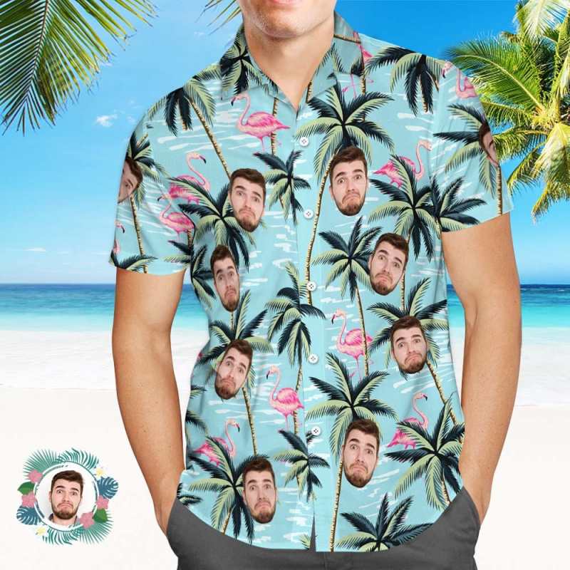 Gepersonaliseerde Blauwe Flamingo-kokospalm-shirt Met Gepersonaliseerd Gezicht, Hawaiiaanse Shirts, Cadeau Voor Hem - CustWitNL