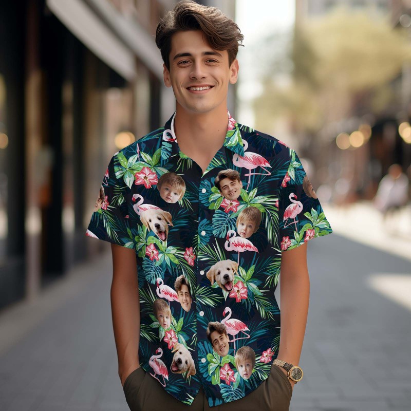 Gepersonaliseerde Hawaiiaanse Shirt Met Gezicht, Gepersonaliseerde Foto Voor Heren, Flamingobloem, Vakantiefeestcadeaus - Tot 3 Gezichten